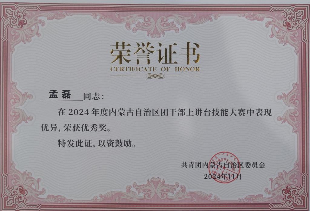 11月16日,由内蒙古自治区团委主办的2024年全区团干部上讲台技能大赛在呼和浩特圆满落幕,来自各盟市团委,直属高校团委、直属企业团委、税务团工委、行业系统团(工、指)委的132名团干部同台比拼,Beat365文学院团学办公室副主任孟磊喜获优秀奖。
