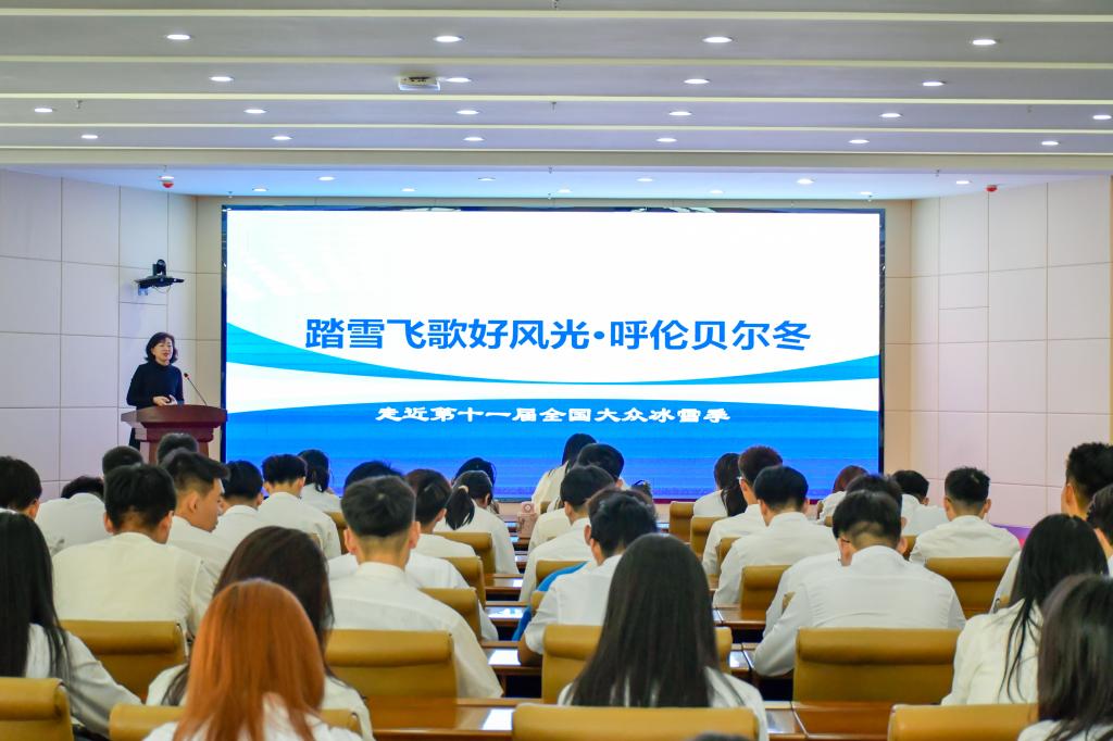 动员大会结束后,旅游地理与历史文化学院副教授张凌对志愿者们进行志愿者通识培训。在通识培训中,张凌为志愿者们介绍了呼伦贝尔的概况,使志愿者们更好地了解自己志愿工作的大环境。带志愿者们了解冰雪旅游的含义,历届全国大众冰雪季的志愿服务情况等。志愿者们认真聆听、积极互动,现场学习氛围浓厚。