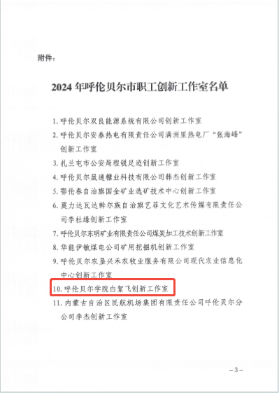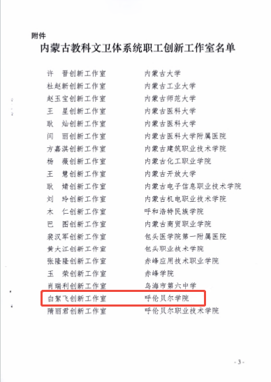 近日,自治区教科文卫体工会及呼伦贝尔市总工会进行了创新工作室评选,Beat365白絮飞创新工作室获评“2024年教科文卫体系统职工创新工作室”和“呼伦贝尔市职工创新工作室”。
