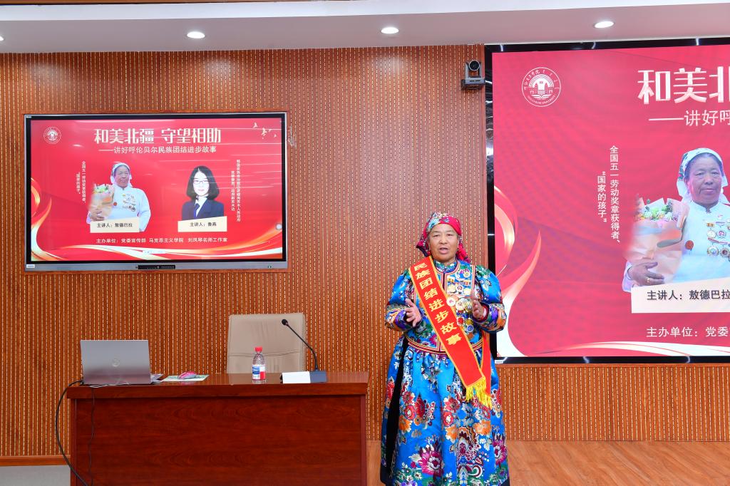 会上,敖德巴拉以质朴真挚的语言,讲述她作为“三千孤儿入内蒙”这一历史事件的亲历者,深情回顾自己在党的关怀下成长成才、为党和国家事业做贡献的人生经历。她的故事,不仅是个人生命的轨迹,同时生动诠释了“三千孤儿入内蒙”蕴含的大爱精神,深刻展现出呼伦贝尔各族人民互帮互助、亲如一家的深厚情谊,让现场师生深切感受到民族团结的强大凝聚力。