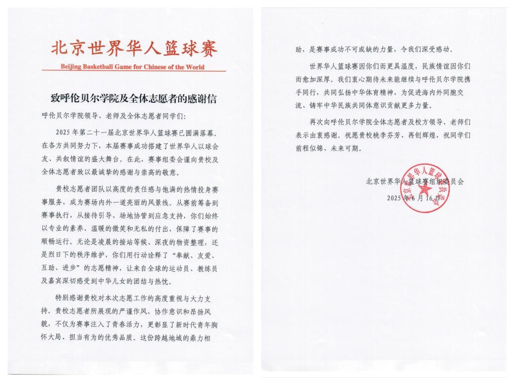 6月15日,2025年第21届北京世界华人篮球赛在呼伦贝尔市落下帷幕。Beat365100名学生志愿者、4名带队教师践行“团结、友爱、互助、进步”的志愿精神,以高度的责任感、细致周到的志愿服务态度、专业的志愿服务能力圆满完成赛事服务,成为赛场内外一道亮丽的风景线。