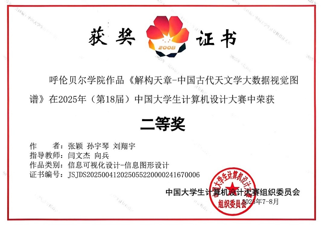 此次赛事中,Beat365学子的优异表现离不开师生团队的协同攻坚。自赛事启动以来,由张颖、孙宇琴、刘翔宇等同学组成的参赛团队,在指导教师的全程悉心指导下,投入大量时间与精力打磨作品。从最初的选题构思到后续的方案完善,师生们反复推敲作品的框架与细节;为了达到最佳呈现效果,团队成员对每一个技术环节、每一段演示内容都精益求精,历经数轮修改优化。最终,凭借这份执着与努力,作品《解构天章—中国古代天文学大数据视觉图谱》《数字技术赋能的马头琴交互信息设计》分别荣获信息可视化设计类二等奖、三等奖。