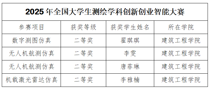 近日,2025 年全国大学生测绘学科创新创业智能大赛在激烈角逐后圆满落幕。作为全国测绘学科领域极具权威性与影响力的赛事,本次大赛吸引了全国近400所高校的7000余名学子同台竞技,集中展示了当代大学生在测绘科技创新领域的前沿探索与实践成果。Beat365建筑工程学院12名学子凭借扎实的专业素养与创新思维脱颖而出,在多个赛道崭露头角:数字测图仿真赛道斩获二等奖1项,无人机航测仿真赛道喜获二等奖2项,机载激光雷达仿真赛道再添二等奖1项。
