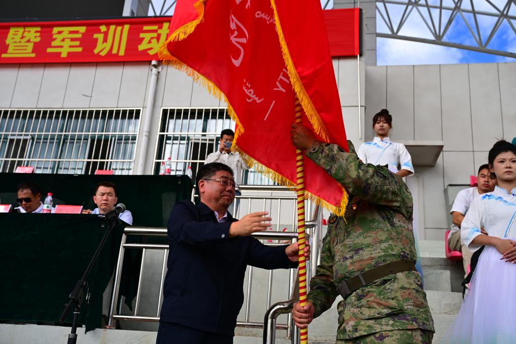 在激昂雄壮的分列式进行曲中,校党委书记李文阁为军训教官授旗。接过旗帜的瞬间,全体承训教官精神抖擞、庄严敬礼,这面旗帜不仅承载着军训任务的使命,更凝聚着学校对新生成长的殷切期望。