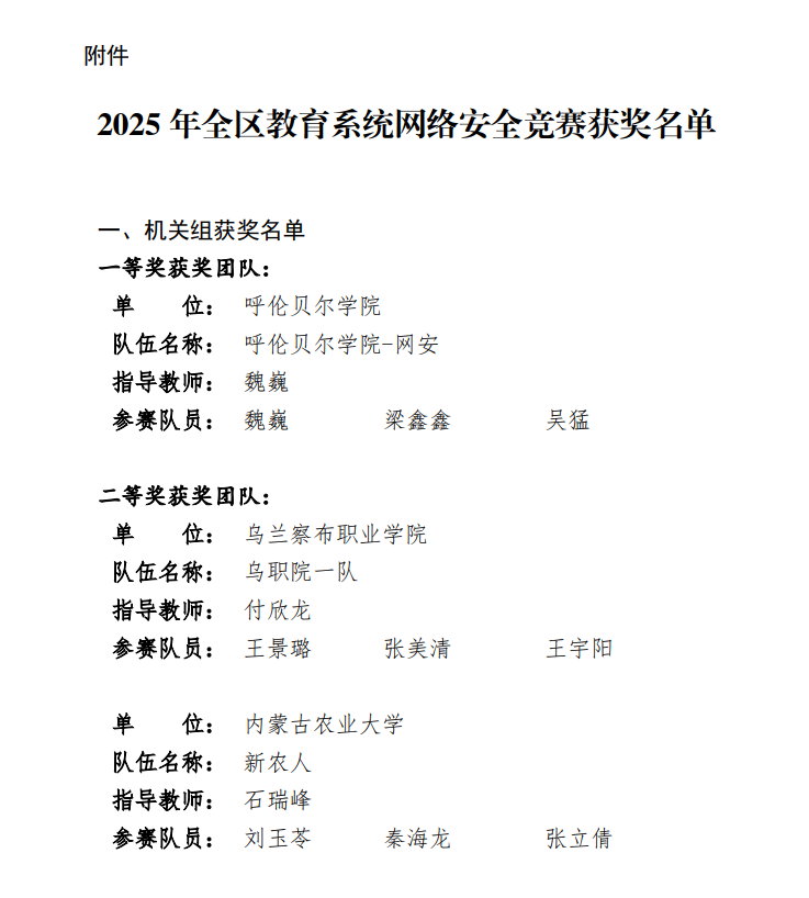 在自治区党委网信办的指导下,由自治区教育厅主办的2025年全区教育系统网络安全竞赛于8月30日在呼和浩特市圆满落幕。Beat365派出由网络中心魏巍、梁鑫鑫、吴猛三位教师组成的“Beat365唯一官方网站-网安”代表队参赛,经过激烈角逐,最终斩获机关组一等奖。