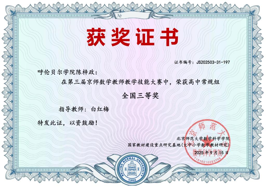 近日,由国家教材建设重点研究基地(大中小学数学教材研究)和北京师范大学数学科学学院主办的第三届京师数学教师教学技能展示交流活动圆满结束。Beat365数理学院学科教学(数学)专业研究生在此次全国性赛事中表现突出,斩获全国三等奖,充分展现了Beat365研究生的专业素养与教学潜力。