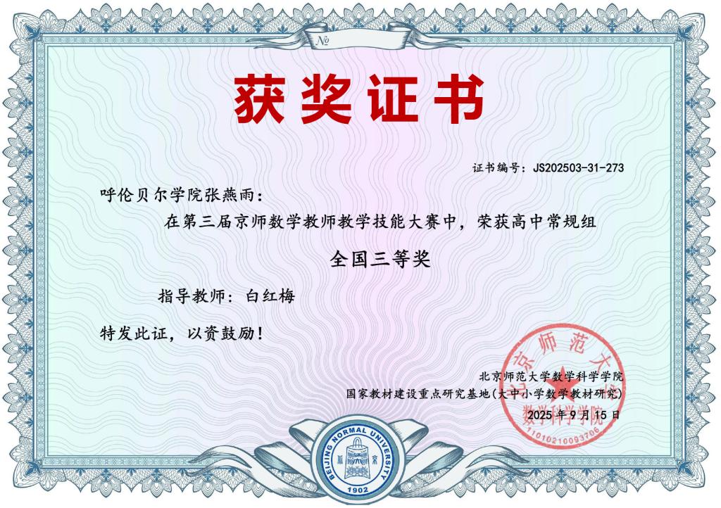 经过激烈角逐,数理学院2023级研究生张燕雨与2024级研究生陈梓政凭借扎实深厚的数学专业知识储备、逻辑清晰且富有创新性的教学设计,在全国众多优秀参赛者中崭露头角,最终双双斩获全国三等奖。
