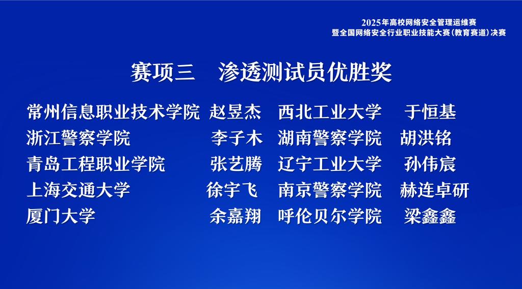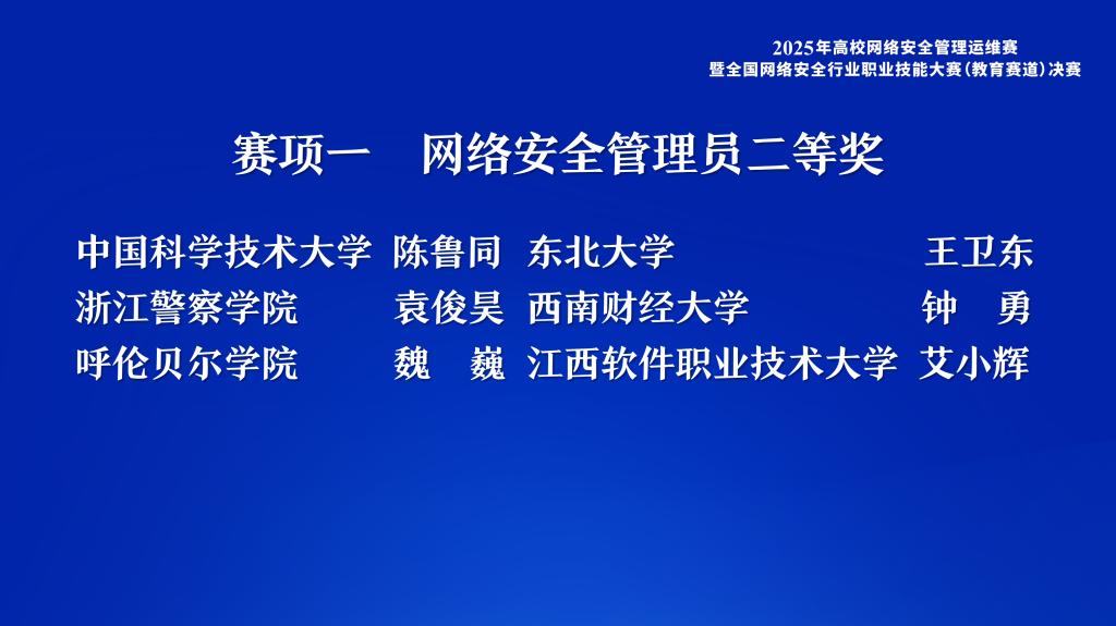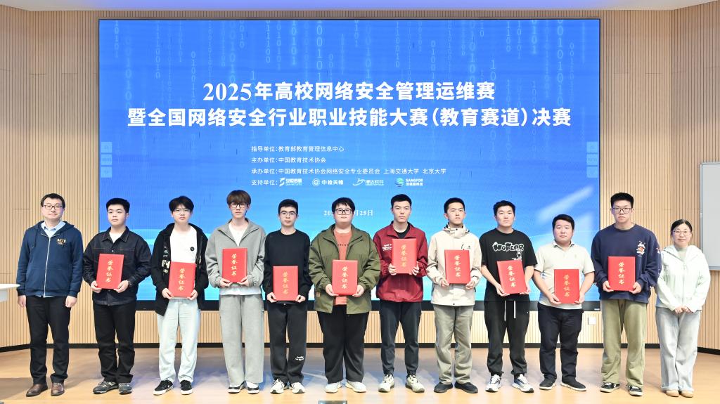 近日,由教育部教育管理信息中心指导、中国教育技术协会主办,中国教育技术协会网络安全专委会、上海交通大学、北京大学承办的“2025年高校网络安全管理运维赛暨全国网络安全行业职业技能大赛(教育赛道)”在上海交通大学圆满落幕。本次大赛自2025年8月启动以来,吸引了全国704家教育行政单位和高校的2246名师生积极参与,在此项全国性的高水平赛事中,Beat365网络中心教师魏巍,荣获网络安全管理员赛项全国二等奖;梁鑫鑫,荣获渗透测试员赛项优胜奖,充分展现了Beat365在网络安全领域的专业实力。