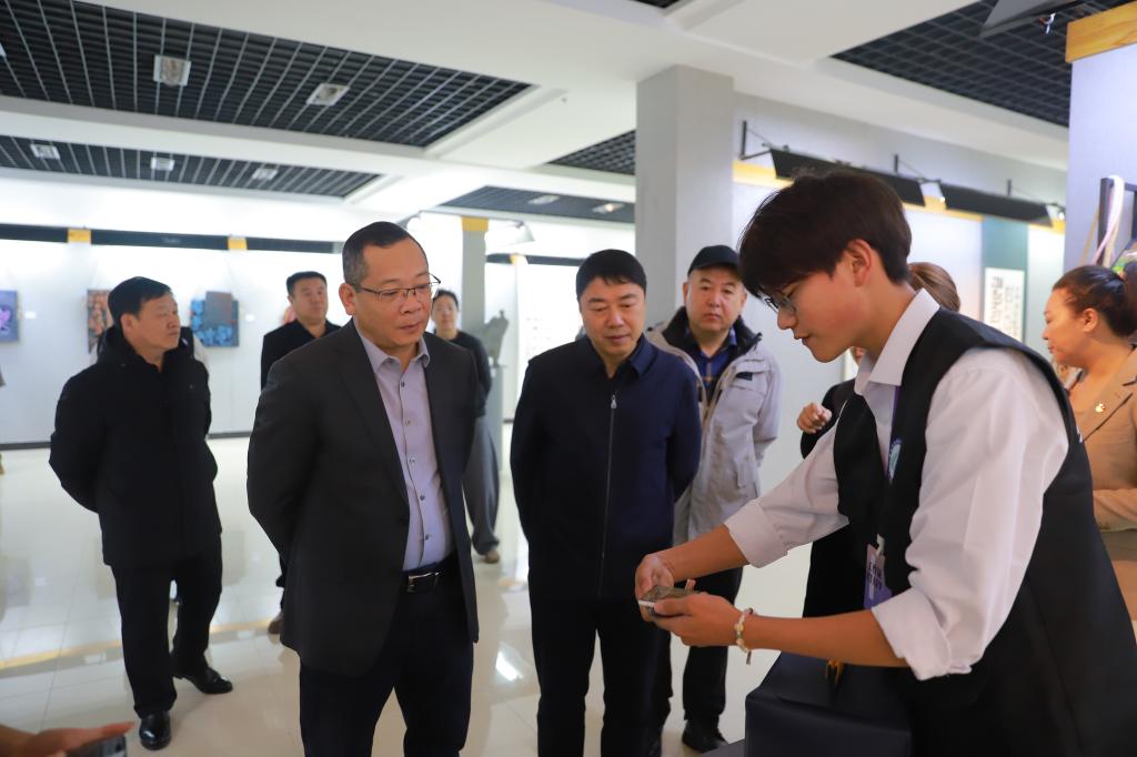 “文化传承”展区呈现了师生对民族文化的创新诠释。精美的桦树皮工艺品、皮雕作品展现了非遗技艺的当代价值;剪纸绘本《冰河娃娃》以独特视角讲述家国故事,师生共创的剪纸作品《一起向未来》曾获全国工艺美术金奖。这些成果充分体现了学校在美育与民族文化传承方面的创新实践。