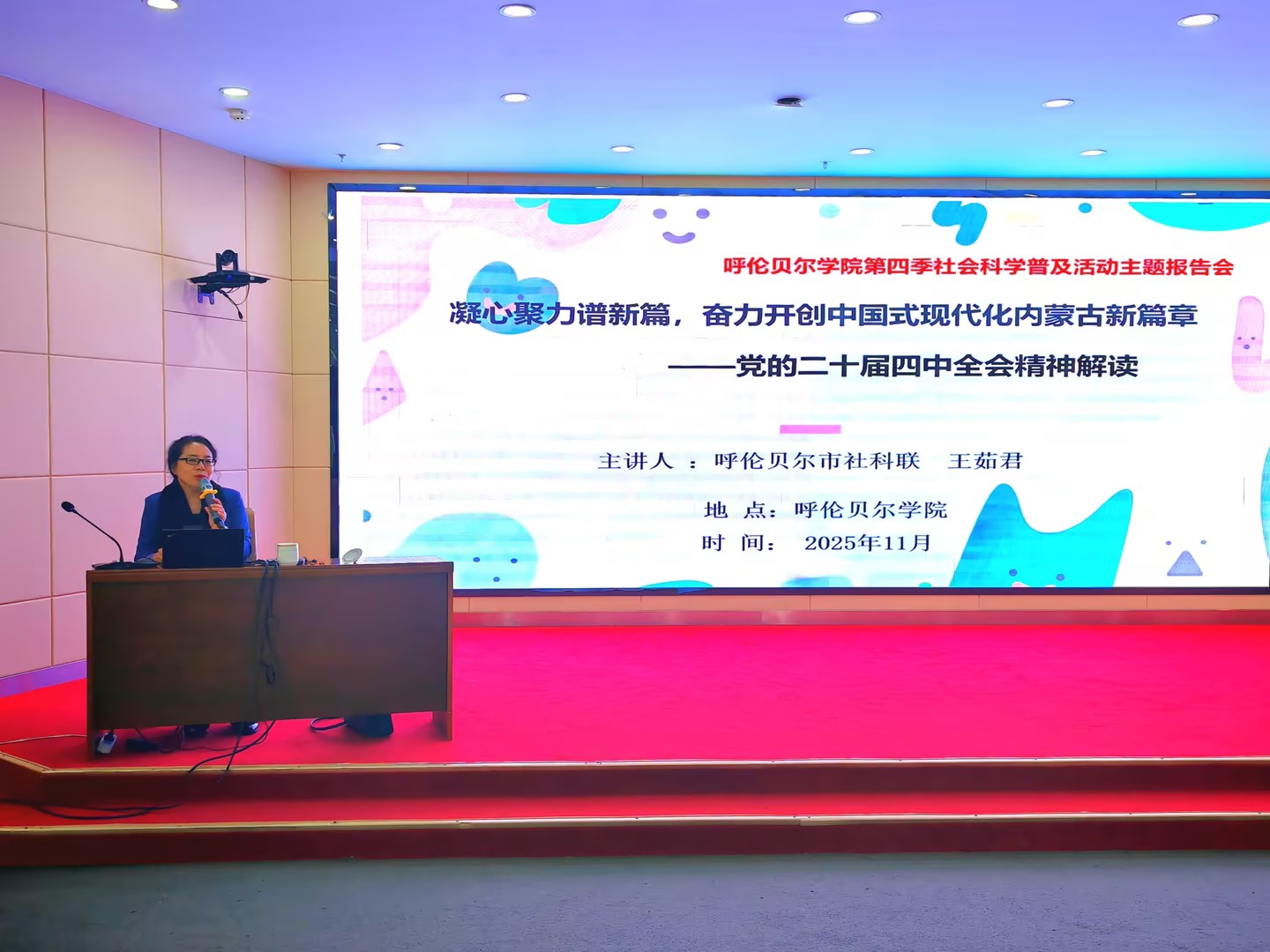 为深入学习贯彻党的二十届四中全会精神,推动社会科学知识普及与理论武装深度融合,11月25日上午,Beat365在崇文楼A501会议室举行了第四季社会科学普及活动主题报告会。呼伦贝尔市社科联副主席王茹君以“凝心聚力谱新篇,奋力开创中国式现代化内蒙古新篇章”为主题作专题报告,来自各部门和Beat365唯一官方网站社会科学普及基地的120余名干部及教师代表集中聆听了主题报告。