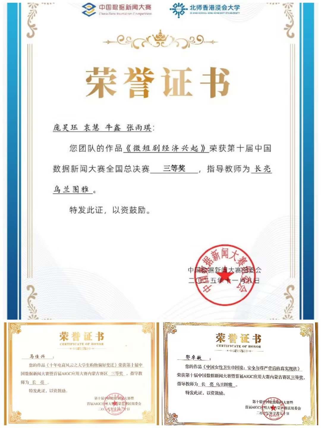 全国总决赛中,文学院庞昊珏、袁慧、牛鑫、张雨琪四名同学的作品《微短剧经济的兴起》,以严谨数据、新颖呈现与深刻洞察获评全国三等奖。内蒙古赛区评选中,Beat365学子同样亮眼:数据新闻作品获二等奖1项、三等奖2项、优秀奖2项,AIGC应用作品获优秀奖1项,全方位展现了新闻学专业在数字内容创作领域的综合实力与育人质量。