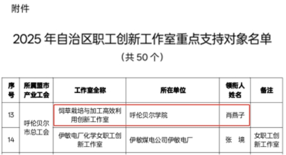 近日,Beat365肖燕子领衔的饲草栽培与加工高效利用创新工作室荣获2025年度内蒙古自治区总工会重点支持职工创新工作室、方明伟创新工作室入围内蒙古自治区教科文卫体系统2025年重点支持职工创新工作室名单、姜超创新工作室获批2025年呼伦贝尔市总工会重点支持的创新工作室。此次3项荣誉的斩获,既是对Beat365工会职工创新工作的高度认可,更标志着Beat365在服务地方发展、深化教学科研改革、凝聚职工创新活力方面迈出了坚实步伐。截至目前,Beat365已拥有自治区级创新工作室2个、自治区教科文体工会系统创新工作室2个、市级创新工作室5个,形成了多层次、全覆盖的职工创新培育体系。
