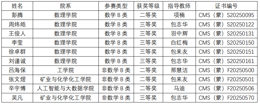 2025年12月24日,中国数学会公布了第十七届全国大学生数学竞赛各赛区成绩。Beat365学子在竞争激烈的内蒙古赛区比赛中荣获多项奖励,展现了Beat365扎实的数学教学功底与学生出色的学习能力。