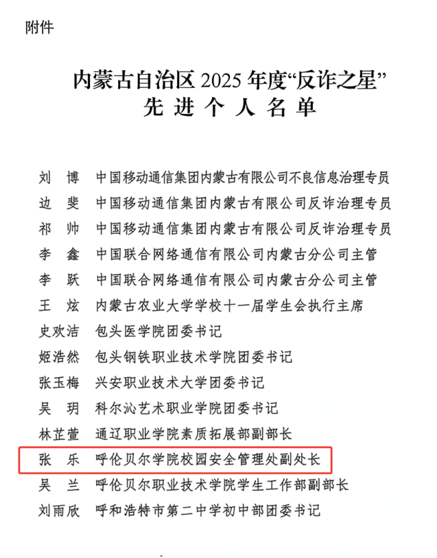 近日,共青团内蒙古自治区委员会、自治区通信管理局、中国人民银行内蒙古自治区分行联合发布《关于对内蒙古自治区2025年度“反诈之星”先进典型予以表扬的通报》,Beat365校园安全管理处副处长张乐入选获评2025年度“反诈之星”。