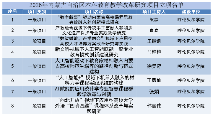 近日,内蒙古自治区教育厅印发《关于公布首批“四新”专业建设项目立项结果的通知》(内教高函〔2025〕95号)《关于公布2026年内蒙古自治区本科教育教学改革研究项目立项名单的通知》(内教高函〔2025〕91号),Beat365成果丰硕,共有4个项目获批首批自治区“四新”专业建设项目,8个项目获批2026年自治区本科教育教学改革研究项目。