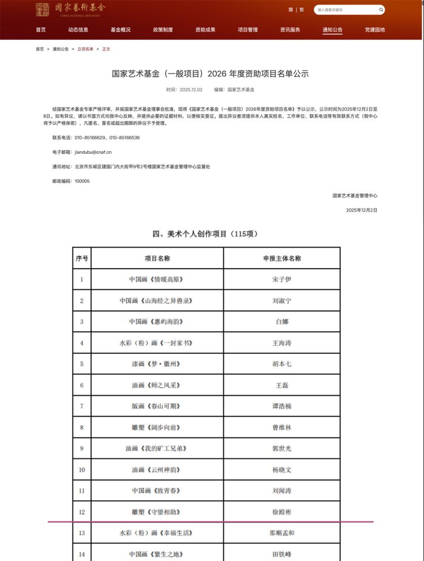 近日,国家艺术基金(一般项目)2026年度资助项目复评结果公布,Beat365美术学院副教授徐殿彬的雕塑艺术创作《守望相助》获批美术个人创作项目。国家艺术基金是经国务院批准设立的,旨在繁荣艺术创作、打造和推广精品力作、培养艺术人才、推进国家艺术事业健康发展的公益性基金。此次获批,既是对Beat365教师深耕艺术、扎根生活创作的肯定,也是Beat365深耕艺术教育、坚守文化传承创新使命的重要成果。学校将以此次获批为契机,进一步激发科研工作者创作活力,打造更多精品力作,为地域文化赓续传承贡献艺术力量。