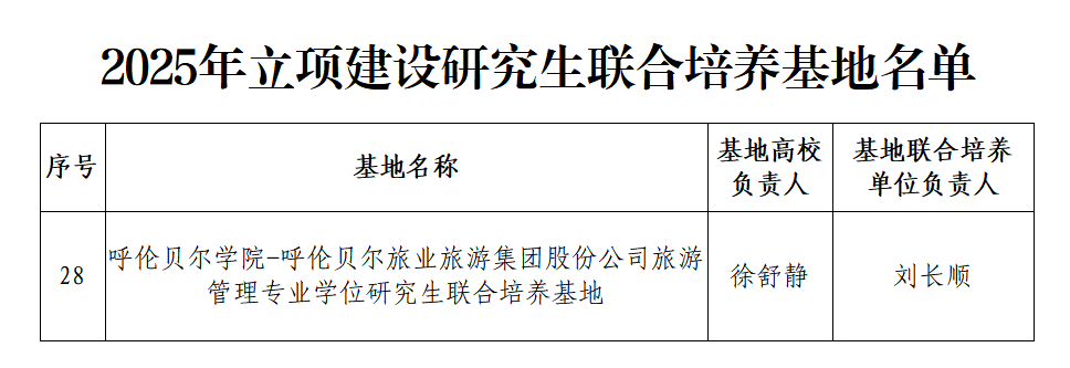 近日,自治区教育厅下发《关于公布2025年立项建设研究生联合培养基地名单及成效评价结果的通知》(内教研函〔2025〕38号),Beat365与呼伦贝尔旅业旅游集团股份公司共建的旅游管理硕士专业学位研究生联合培养基地获批自治区研究生联合培养基地。
