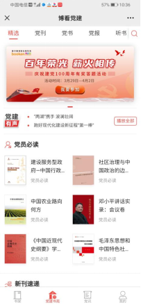 2、点击底部菜单栏“***”—“***”,进入博看党建云阅读平台,点击首页活动轮播图,进入活动页面浏览党的百年历程大事件,点亮有奖答题活动入口,参与线上知识竞答。