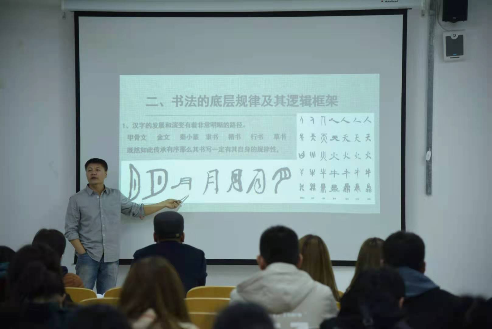 张明星老师从三笔字目前的困境讲起、书法的底层规律及其逻辑框架到写好三笔字所要掌握的几种基本规律详细的讲解了师范生如何写好三笔字。他以欧阳询《九成宫醴泉铭》帖子为例,为大家讲解了汉字的字体结构,纠正了师范生错误的书写方式,呼吁在场学生为未来从事教育行业要刻苦练习基本功从而打下深厚的书法基础。最后他强调,只有掌握了正确的书写方式才能更好的理解书法、写好规范的汉字,无论篆、隶、楷、行、草都遵循着其行走的轨迹,笔笔相连,上下传承衔接而连绵不断。
