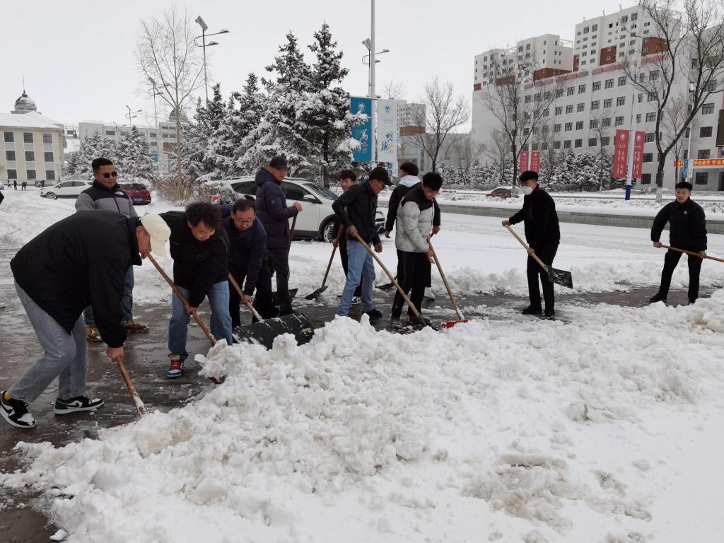 参与志愿活动的同学们,拿好自己的工具,投入到清扫积雪的“战斗中”。大家挥舞着手中的铁锹和铁铲对艺术楼门口的积雪进行清扫,有的铲、有的推,齐心协力,配合默契。寒冷的天气被同学们的热情所覆盖,他们在雪地里忙碌的身影成为校园里最亮丽的风景,让这个寒冷的四月也变得格外温暖。