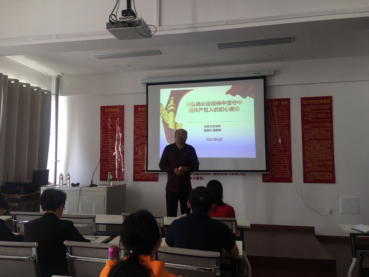 黄福令副教授以“在弘扬长征精神中坚守中国共产党人的初心使命”为主题,围绕红军长征路线,从遵义会议转折、巧渡金沙江、强渡大渡河、飞夺泸定桥、爬雪山过草地、攻克天险腊子口、三大主力会宁会师等节点生动地诠释了长征精神的实质内涵。黄福令副教授声情并茂地讲述了红军悲壮、艰苦卓绝的长征历程,带领大家回顾了那段炮火硝烟的岁月。