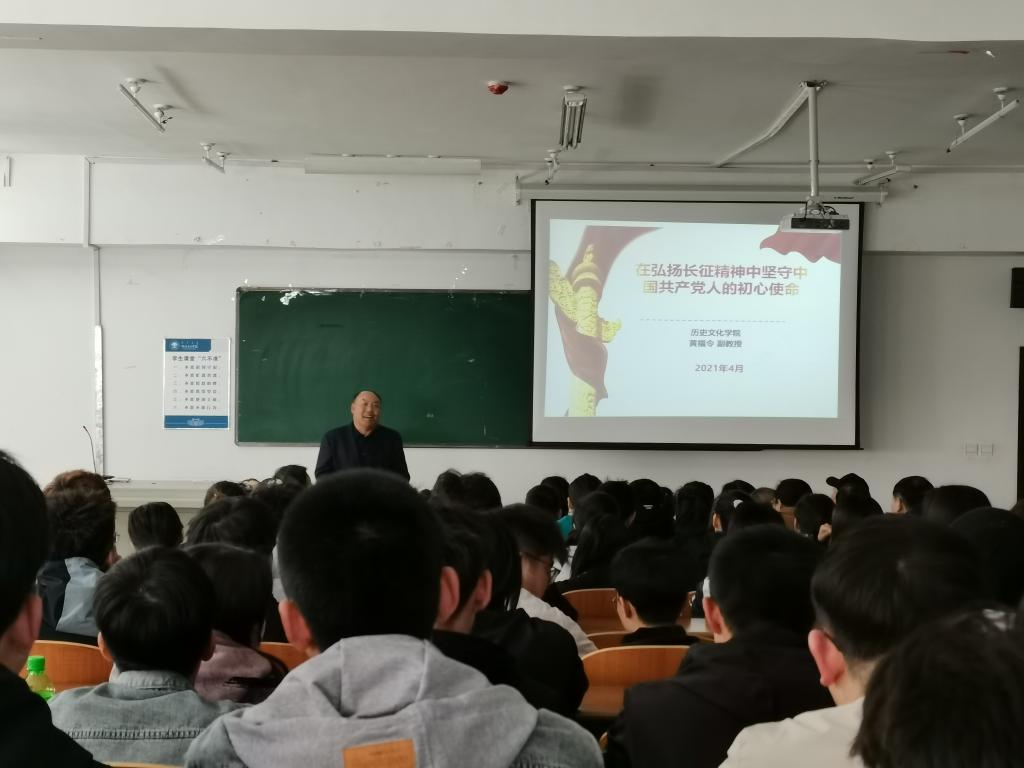 “弘扬长征精神这一政治优势,无论过去、现在和将来,都是我们战胜困难和风险、解决问题、创造新业绩不可缺少的强大精神动力。虽然再没有雪山和草地,但我们同样面临着历时和时代的挑战。长征精神所体现的这种为民族不畏艰险、不怕牺牲、艰苦奋斗的民族使命感和历史责任感,正是中华民族“天下兴亡,匹夫有责”,百折不挠、顽强拼搏、自强不息伟大民族精神的生动展现。”黄福令老师以“红军长征路线示意图”为主线,从长征的原因、转折点、意义三个方面,以“四渡赤水”“懋功会师”“吴起镇会师”深刻细致地为师生讲述了长征的故事和长征精神。