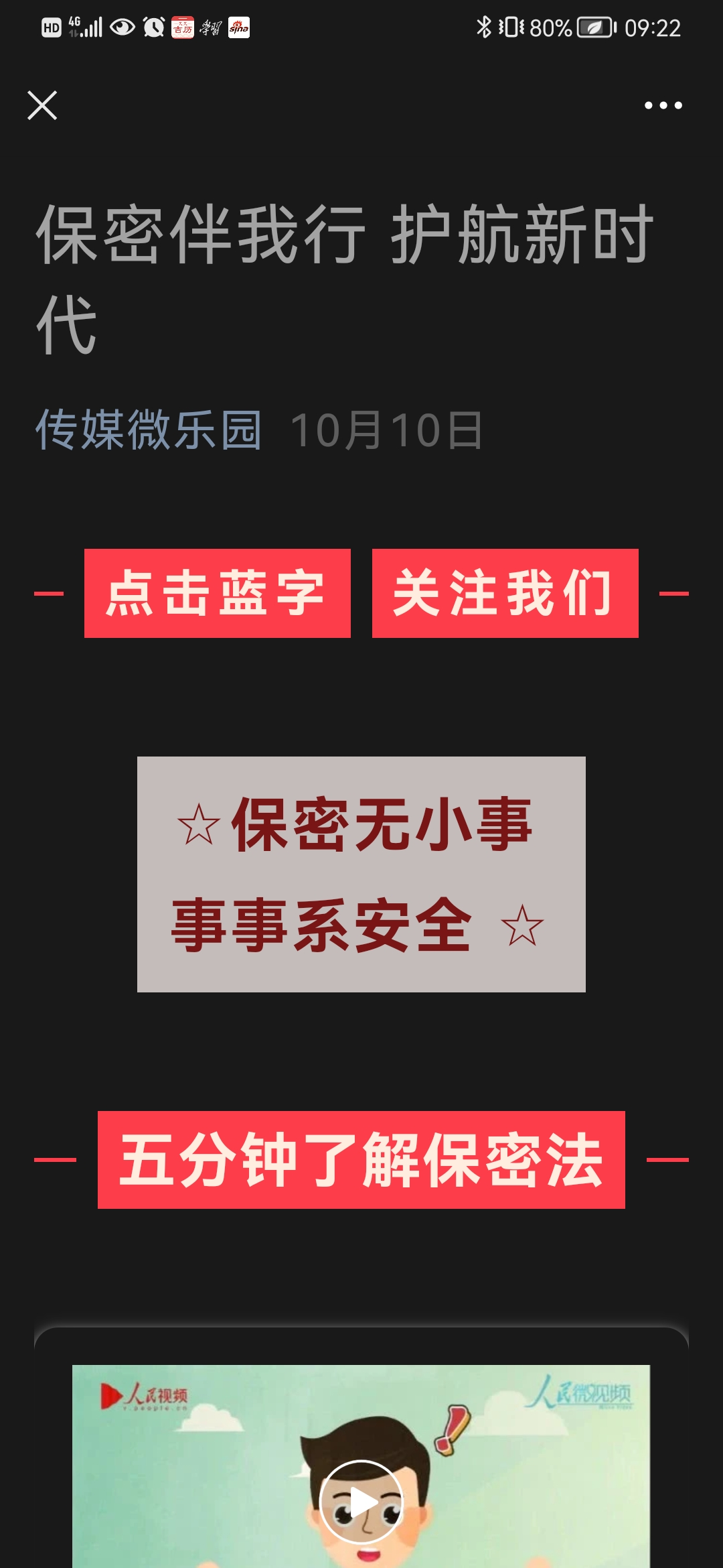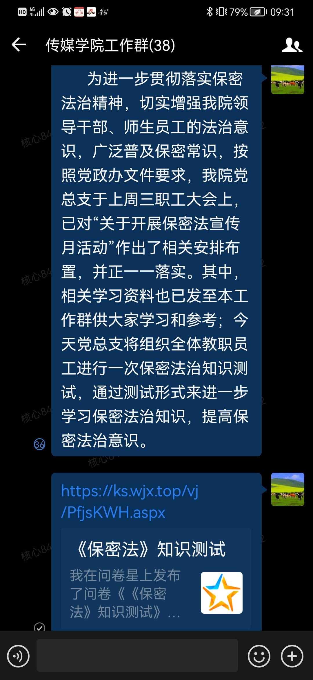 传媒学院党总支高度重视《保密法》的学习贯彻与宣传教育工作,严格落实国家保密管理工作制度,自觉履行保密义务和责任,按照学校文件要求制定了活动方案,并组织师生积极开展了内容丰富、形式多样的宣传教育系列活动。本次系列活动,将《保密法》的宣传学习与“网络安全周”宣传教育相结合开展。活动通过会议部署、文件学习、设置宣传板、线上答题、线下抽查、“微乐园推文”等多种形式,丰富了活动内容,提高了宣传教育效果。