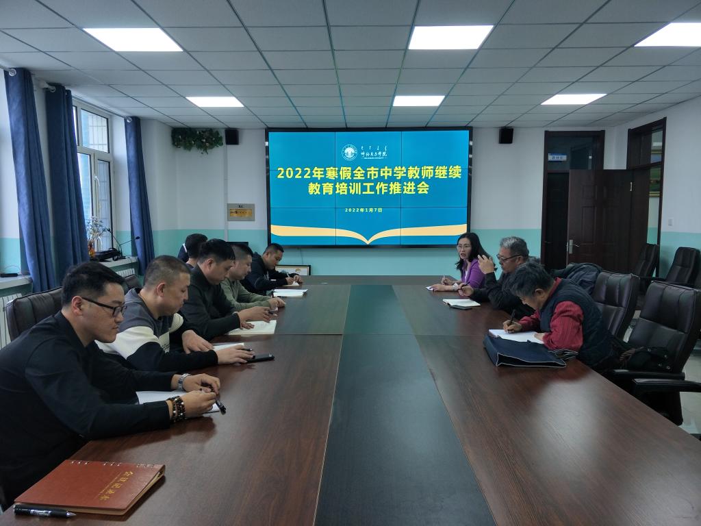 1月7日,继续教育学院召开了“2022年寒期全市中学教师继续教育培训工作推进会”,班子3位成员以及相关人员参加了会议。