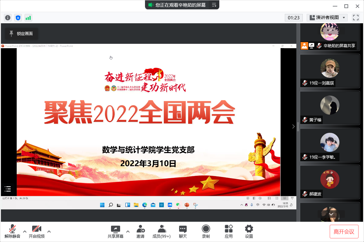 为进一步学深、悟透全国“两会”精神,将数学与统计学院师生的思想和行动统一,有序推动学院各项工作的开展,数学与统计学院于3月10日至16日以专题学习会、特色党日活动、线上主题团日活动等多种形式传达学习习近平总书记在“两会”期间的重要讲话和全国“两会”精神。