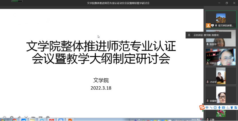 为扎实推进师范专业认证工作,促进师范专业认证申报工作有序进行,3月18日,文学院召开“整体推进师范专业认证动员会暨期初教学研讨会”。根据疫情防控要求此次会议采用线上方式进行。会议由文学院副院长蔡文婷主持。
