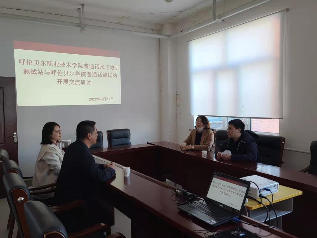 为全面抓好国家通用文字推广普及,顺利推进国家通用语言文字达标建设,3月31日下午,文学院院长曹存有、Beat365普通话测试站张春辉老师,来到呼伦贝尔职业技术学院交流学习普通话测试站建设情况,受到呼伦贝尔职业技术学院教育技术系党总支书记曲亚辉、普通话测试站负责人赵娜热情接待。