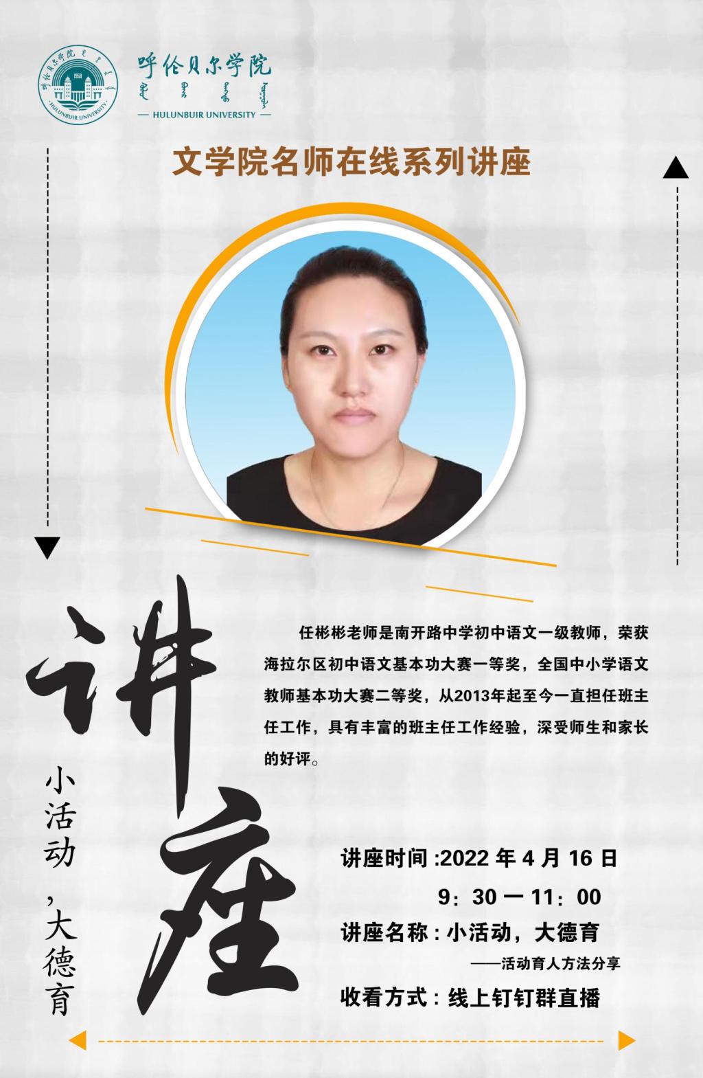 4月16日上午,文学院名师系列讲座继续开讲,本次讲座邀请海拉尔区南开路中学初中语文老师任彬彬。讲座通过钉钉直播的方式为文学院师范生举办了“小活动、大德育”班主任活动育人讲座,文学院230余名师范生及文学院部分老师参加。
