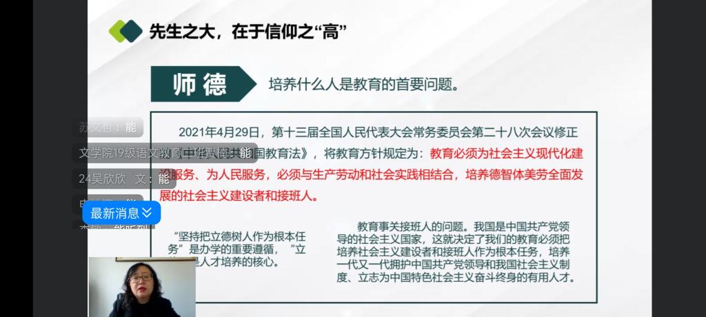 为了进一步提高师范生的师德修养,实现立德树人的目标,4月23日上午,文学院特邀海拉尔区第七中学校长张海红作《立德修身 做“大先生”》专题讲座,本次线上讲座由文学院实训中心主任曲建华主持,文学院副院长蔡文婷及各年级班主任、文学院240余名师范生参加。