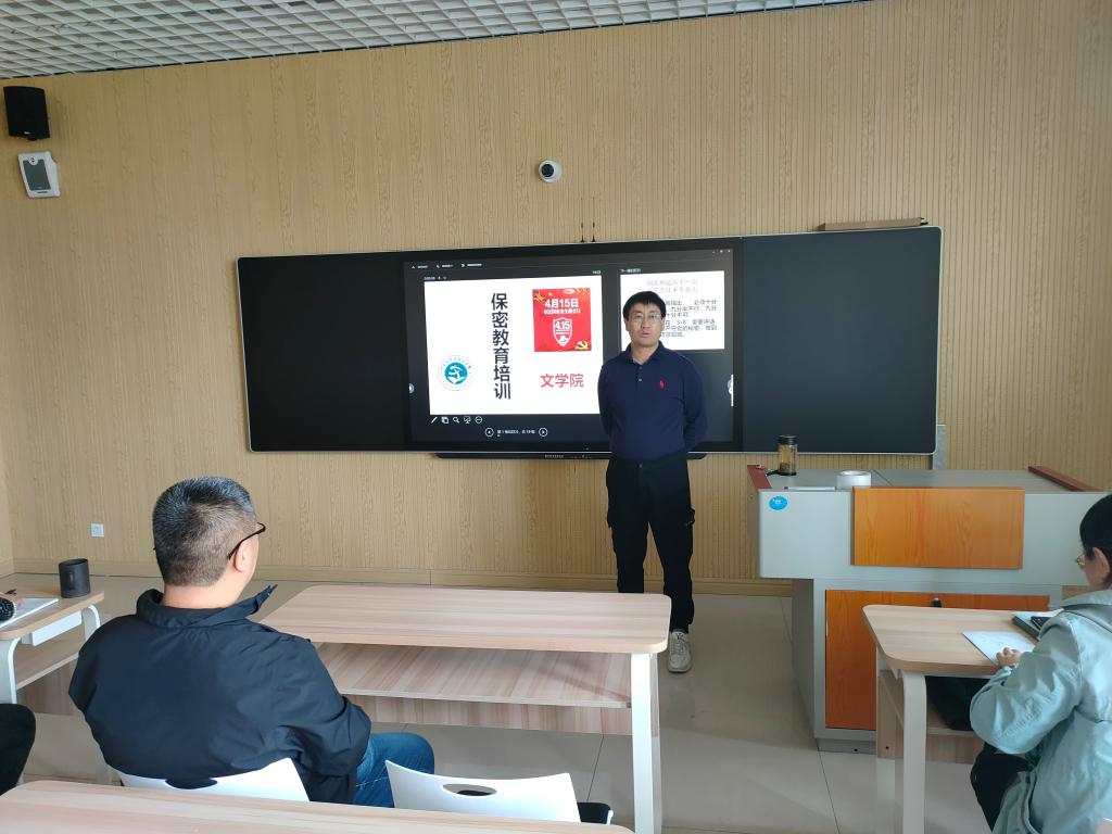为进一步增强广大教职工国家安全意识和保密意识,自觉履行维护国家安全职责,深化平安校园建设,5月11日下午,文学院在崇文楼B座502智慧教室开展安全保密教育专题课,文学院院长曹存有主讲,文学院全体教职工参加。