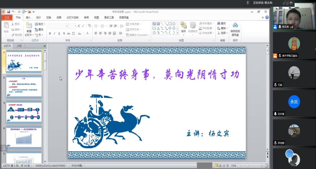 5月26日晚,美术学院通过腾讯会议线上举行2019级考研经验分享交流会。美术学院2019级全体学生参加,会议由辅导员陈征老师和杨文宾老师主持。