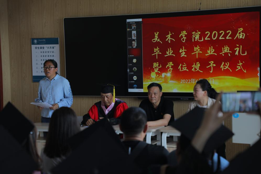 美术学院党总支书记包德、院长李鑫、党总支副书记张巍巍、团学办主任肖慧英,毕业班班主任、辅导员以及部分美术学院专任教师出席典礼,线上线下共有140余名同学参加。肖慧英主任主持典礼,