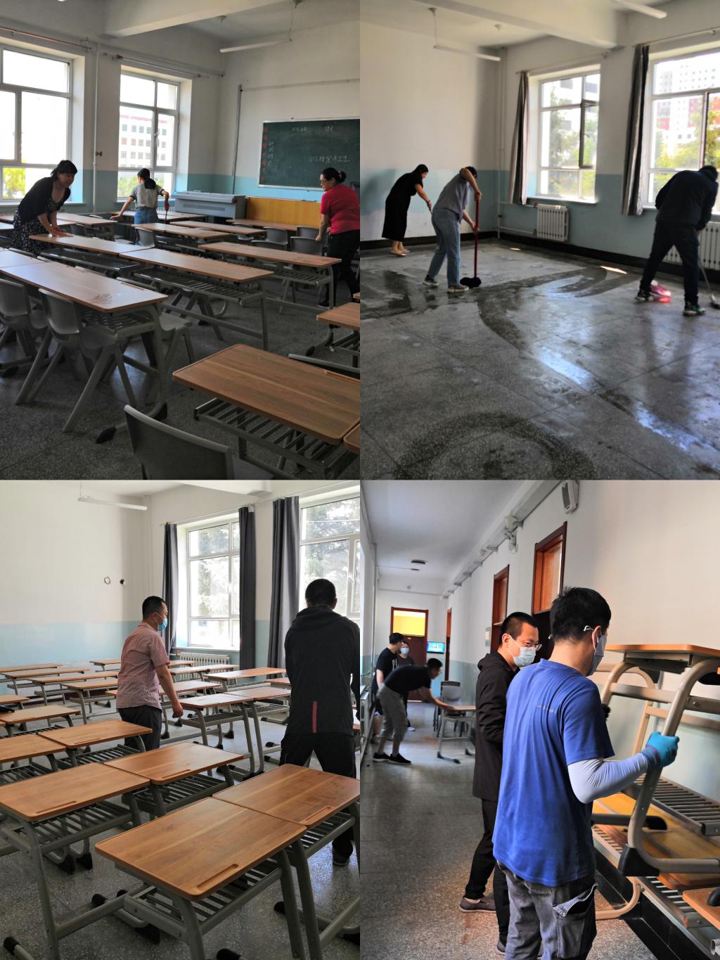 为迎接新学期做好准备,6月23日,外国语学院组织教师打扫师专楼教室卫生。