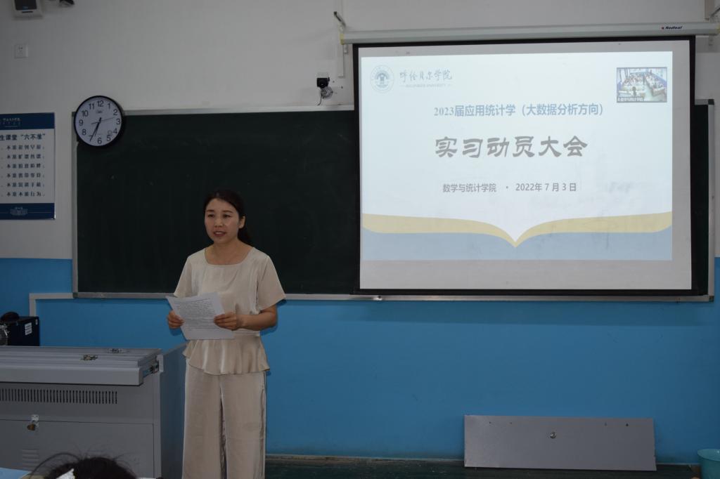 会上,数学与统计学院院长张桂芝做了动员部署。她强调,毕业实习是人才培养的一个重要环节,是学生对所学知识和技能进行实践运用的重要过程,对于锻炼、提高学生的社会适应能力,顺利择业、就业具有重要意义。并对学生提出了三点要求:一要珍惜机会,遵守纪律。在实习期间服从实习指导教师和实习管理教师的双重管理;二要安心学习,勤于思考,认真完成毕业论文;三要加强交流,增进了解。要提高安全防范意识,提高自我保护能力。