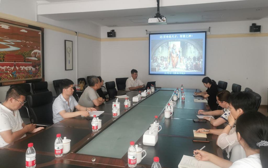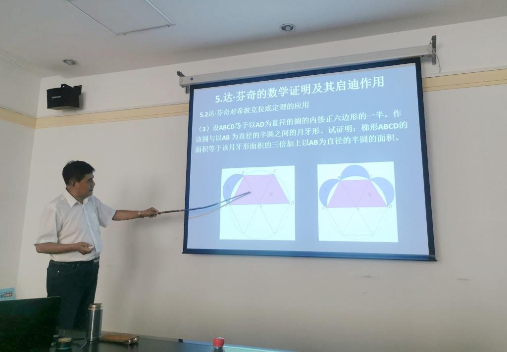 座谈会上,代钦教授以《神坛上的达·芬奇——以达芬奇的数学手稿为中心》为题,通过对达·芬奇手稿中包含的比例理论、几何图形的求面积方法、精湛的作图方法、勾股定理和希波克拉底定理等图片的展示、介绍了达·芬奇辉煌成就和睿智的思想,阐述了达·芬奇的数学思想、数学精神和数学应用。