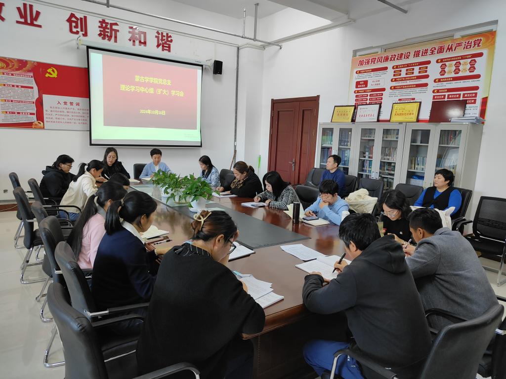 10月16日下午,在崇文楼B221会议室,蒙古学学院召开党总支理论学习中心组(扩大)学习会。学习会由学院党总支书记格根塔娜主持,学院党总支理论学习中心组成员及全体教职工参加。