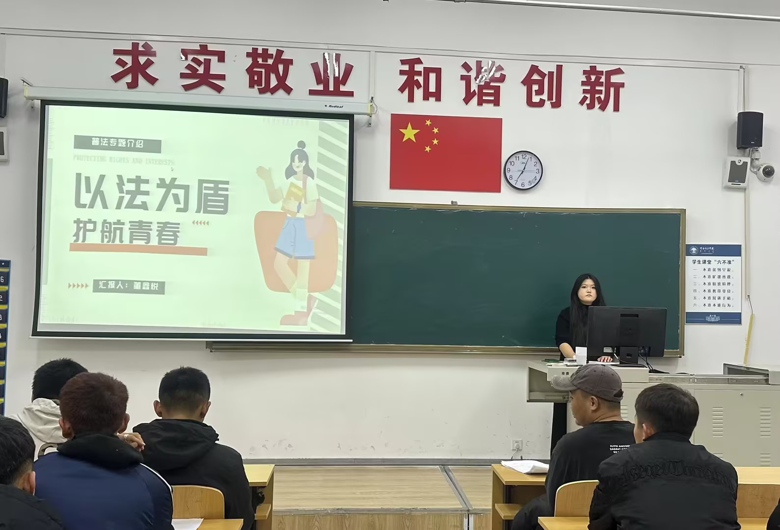 宣讲主要围绕校园生活中常见的法律内容,结合实际案例,深入浅出地讲解了在校生可能面临的法律问题及其应对策略,引导学生树立正确的价值观和法律意识。同时对同学们在大学生活中时常会面临的各种法律问题和道德抉择进行了详细的解答和专业的指导,让大家深刻认识到,“法”是保护大学生最有力的武器。宣讲过程中,气氛热烈而融洽,互动交流频繁。董鑫悦以既轻松又不失严肃的态度,引导同学们深入思考法律在生活中的重要性。