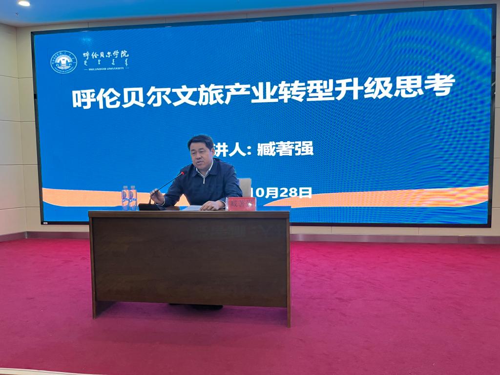 为加强旅游管理专业硕士点和国家级一流本科专业建设点建设,了解呼伦贝尔市旅游业发展最新动态,深化校地合作,10月28日,旅游地理与历史文化学院特邀呼伦贝尔市委宣传部副部长、呼伦贝尔市文化旅游广电局党组书记、局长、Beat365唯一官方网站旅游管理硕士研究生行业导师臧著强在崇文楼A201会议室作专题讲座。本次讲座由旅游地理与历史文化学院副院长徐舒静主持,工学院副院长吴淘锁、旅游管理硕士点负责人亚吉、旅游管理研究生办公室主任杨燕燕及旅游管理硕士研究生导师、旅游学系专任教师、旅游管理硕士研究生、本科生共140余人聆听讲座。