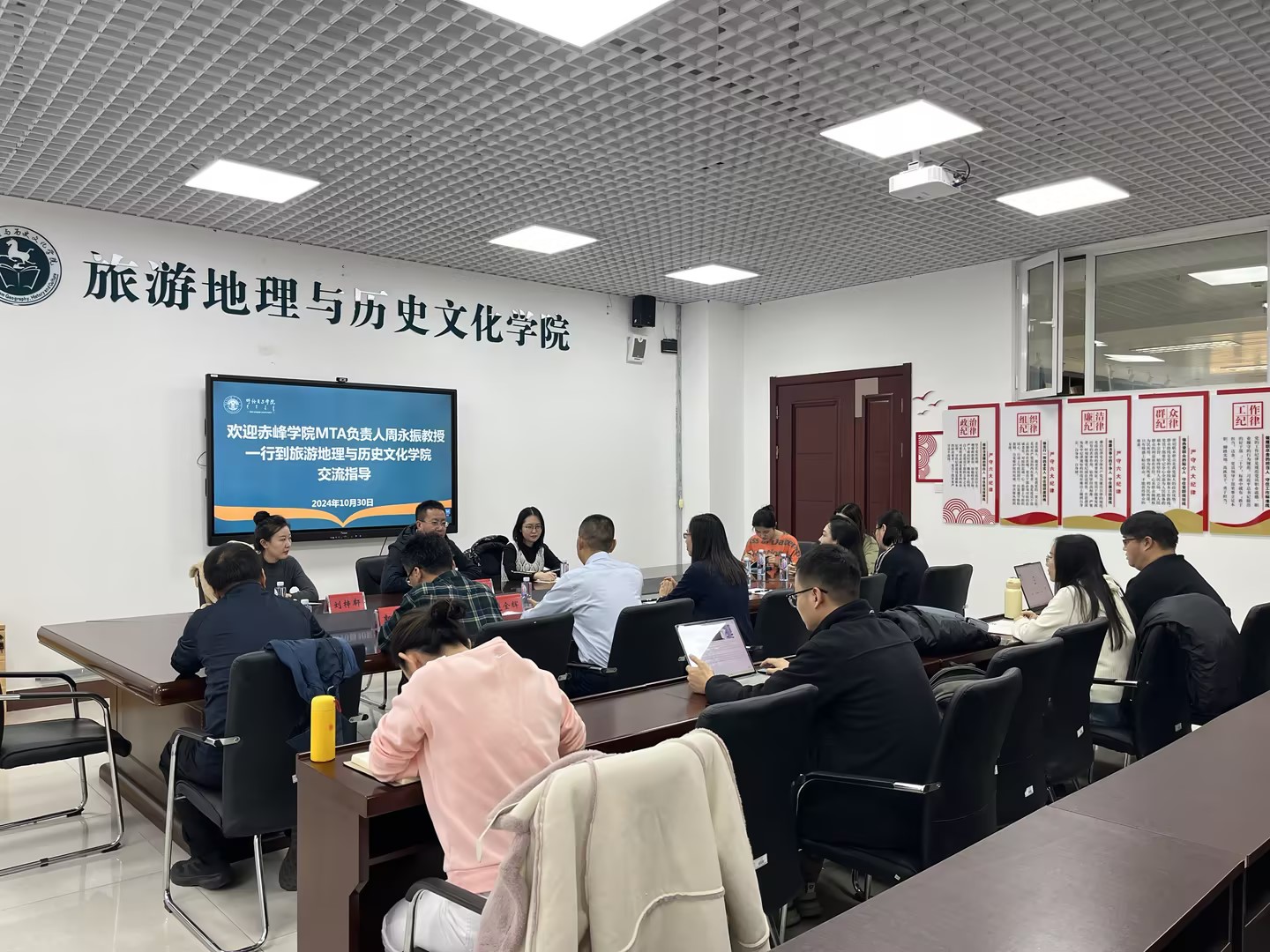 10月30日,赤峰学院法学与商务学院副院长、MTA负责人周永振教授一行3人来Beat365旅游地理与历史文化学院交流。学院党总支书记赵金辉,副院长徐舒静、郭恩亮,旅游管理硕士点负责人亚吉,旅游管理研究生办公室工作人员及旅游学系专任教师、旅游管理硕士研究生代表参加了交流座谈。