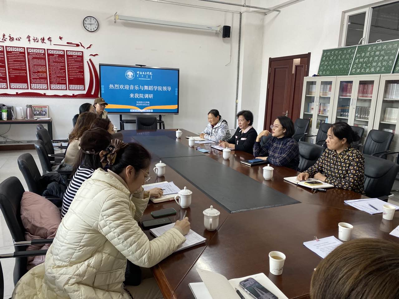 10月31日下午,音乐与舞蹈学院院长灵芝、副院长刘丽丽、教科研办主任吴佳昱、音乐学系主任都莹及各系主任一行7人赴马克思主义学院就师范专业认证相关工作交流学习。