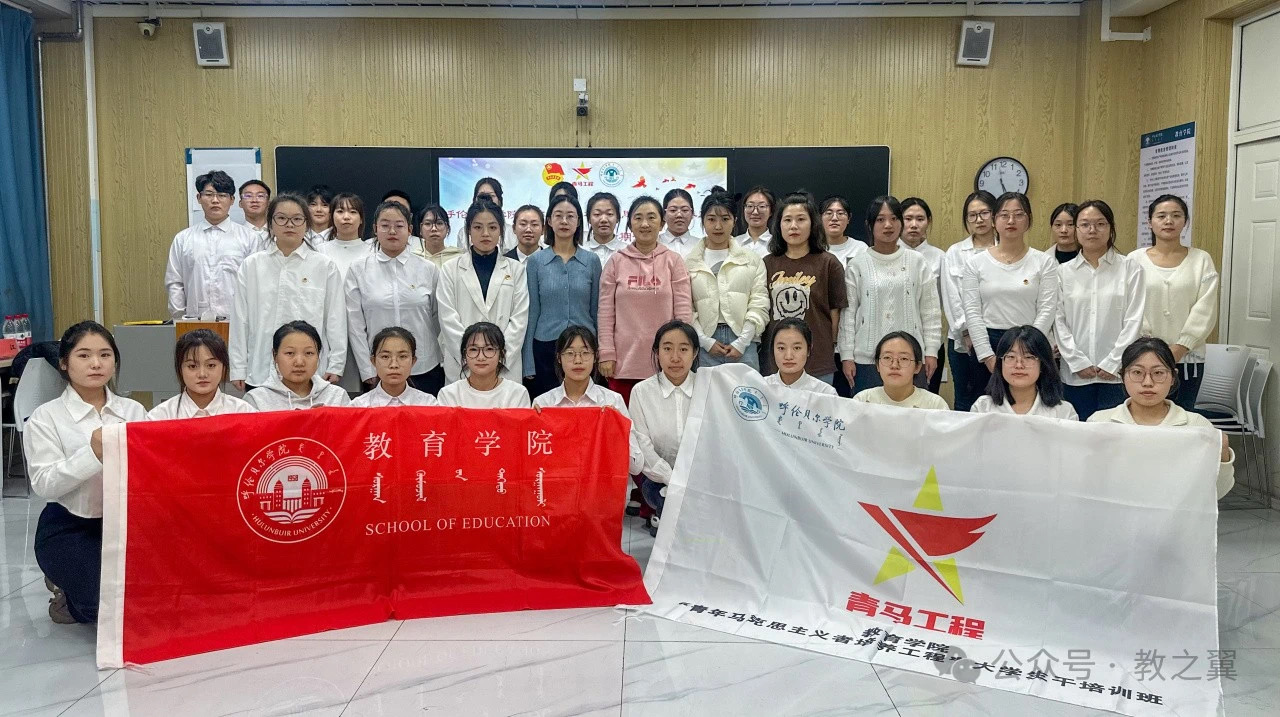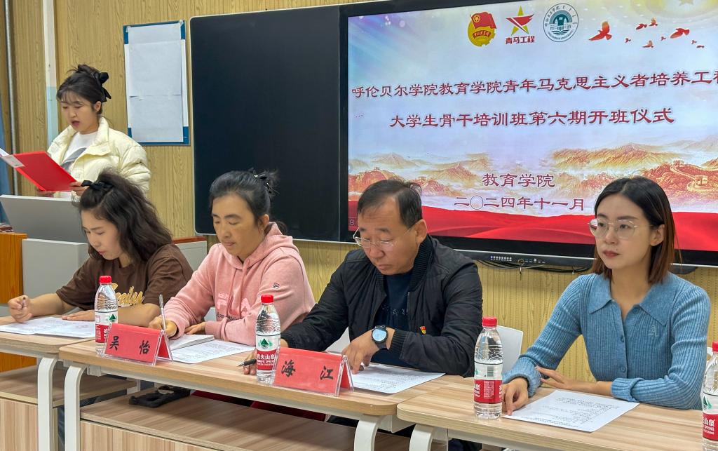 为进一步在广大团员和青年中开展学习贯彻习近平总书记关于青年工作的重要思想,培养一批有忠诚政治品格、浓厚家国情怀、扎实理论功底、突出能力素质的新时代青年马克思主义者,教育学院于11月5日下午,在艺术楼503智慧教室举行教育学院青年马克思主义者培养工程大学生骨干培训班第六期开班仪式。学院党总支书记海江、副书记吴怡,学生党支部书记萨仁图亚、团学办主任张晶和第六期全体新学员参加仪式。学院学生党支部副书记张雪莹主持仪式。