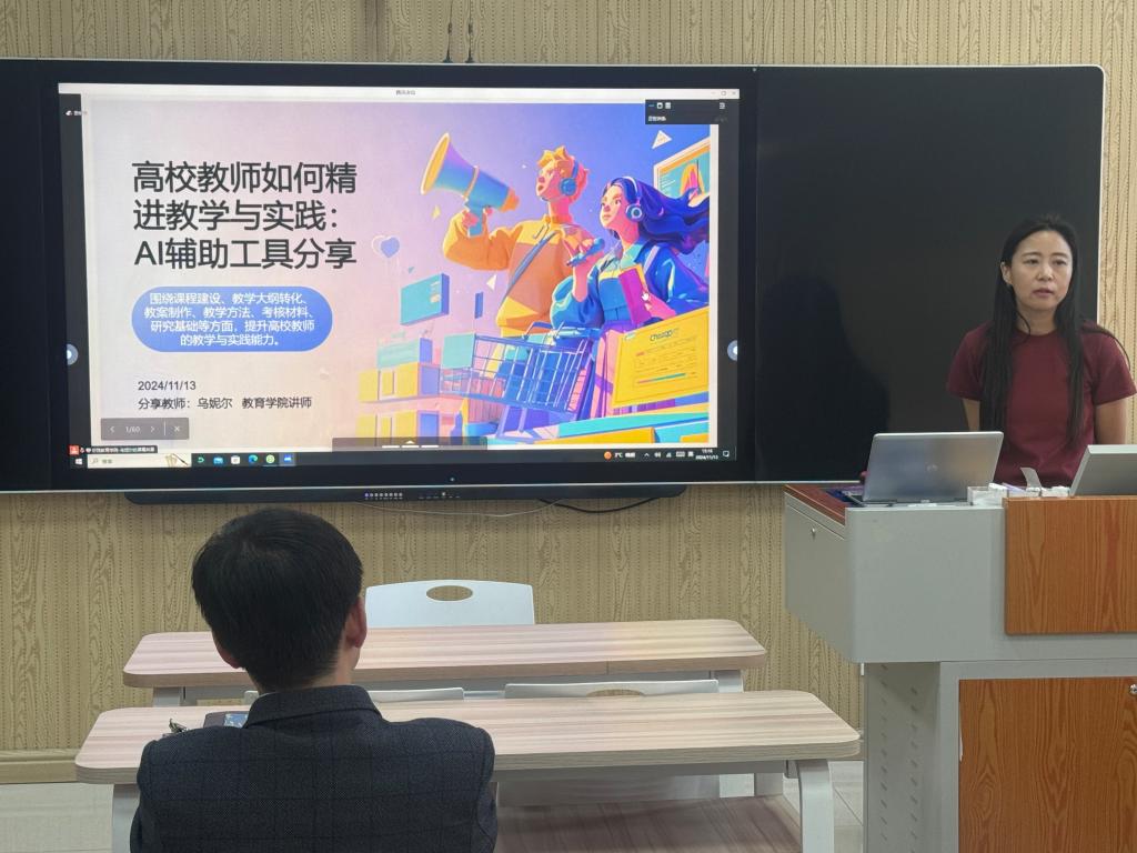 为进一步促进学科建设高质量发展,强化文学院教师队伍的教学、科研实力,让数字资源、人工智能等辅助手段进一步提升教师的教学能力和科研素养,11月13日下午,文学院特邀教育学院在读博士乌妮尔老师开展题为《高校教师如何精进教学与实践:AI辅助工具使用技巧》的讲座。会议由文学院副院长李晓玲主持,学院全体教师聆听了本次讲座。