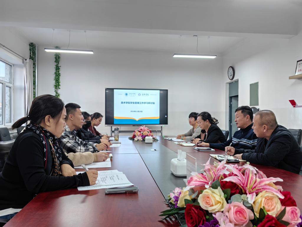 11月19日,美术学院在尚行楼309会议室召开学生管理工作学习研讨会。学院领导班子成员及全体专兼职辅导员参加了学习研讨会。会议由学院党总支副书记张巍巍主持。
