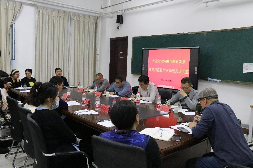 11月29日,林海日报社与文学院在崇文楼B428会议室开展交流活动,旨在深化校媒合作、促进北疆文化传播与教育发展。林海日报社党总支书记、社长孙勇,党总支副书记、总编白铁辉等一行5人,文学院院长曹存有、副院长林秀丽、副院长李晓玲及新闻学专业全体教师和实习生代表参加了此次活动。