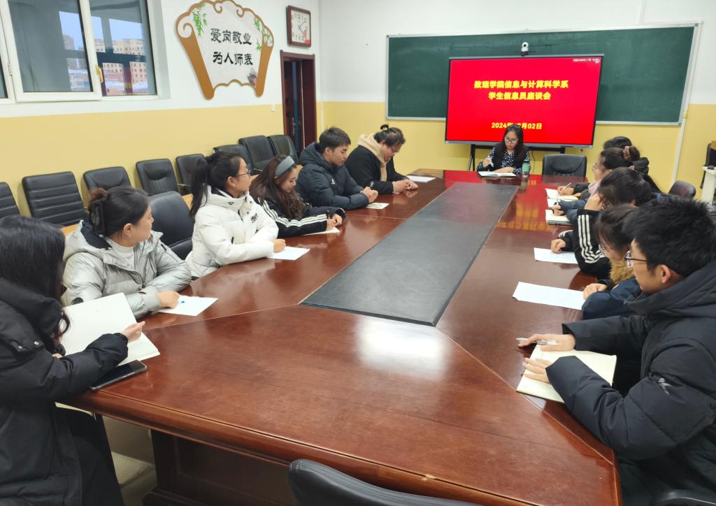 为进一步加强教学质量监控,及时、准确了解并解决学院教学运行过程中存在的问题,提升教学质量,12月2日,数理学院信息与计算科学系在笃学楼410会议室召开了2024-2025学年第一学期教学信息员座谈会。数学与应用数学专业(信息和计算科学方向)全体教学信息员参加座谈会。座谈会由系主任敖国艳主持。