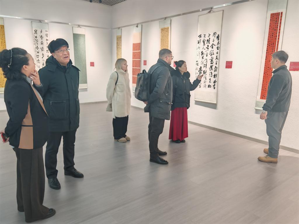 代表团一行参观了正在举行的“翰墨歌盛世 书香颂北疆”书法作品展。美术学院党总支书记巴达日呼代表学院对代表团一行的到来表示热烈欢迎,并向代表团简要介绍了美术学院的基本情况。国画与书法系主任张明星介绍了本次书法展的意义及中国书法传统文化的魅力。